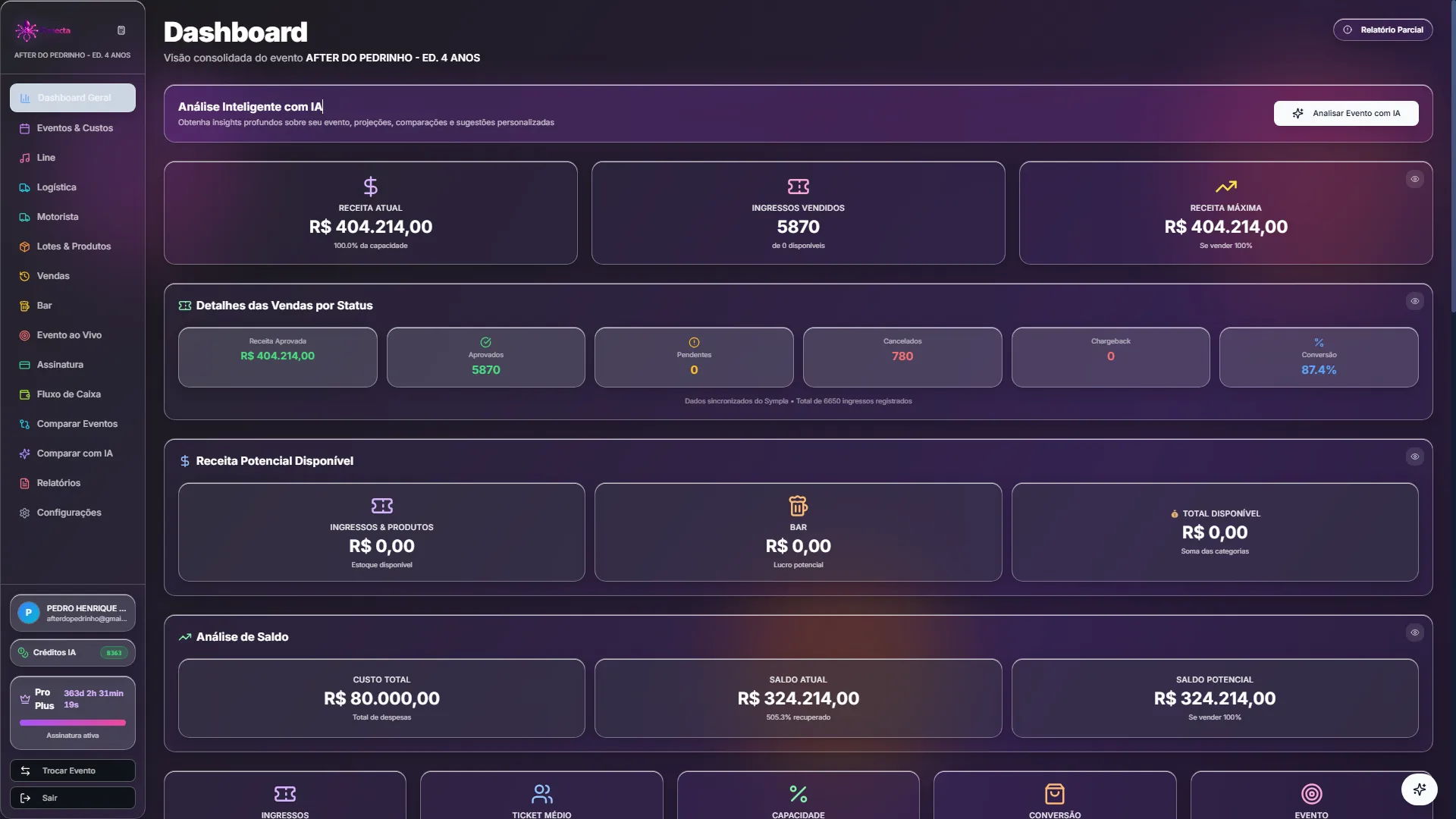 Artistas, custos, vendas, logística, bar... Tudo em um só lugar. Saiba exatamente quanto você lucrou.